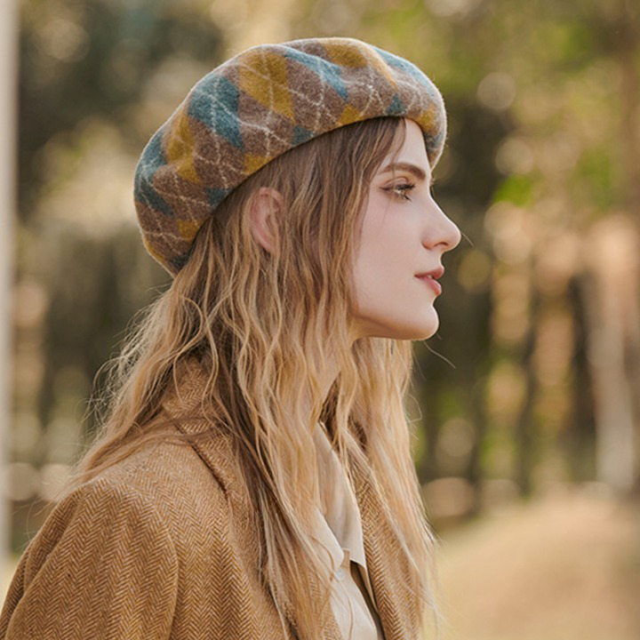 Le motif de losanges marrons et bleus sur le béret crée un look rétro chic qui rappelle les années 60 et 70. Les couleurs chaudes et froides se marient parfaitement pour créer un contraste subtil mais élégant.