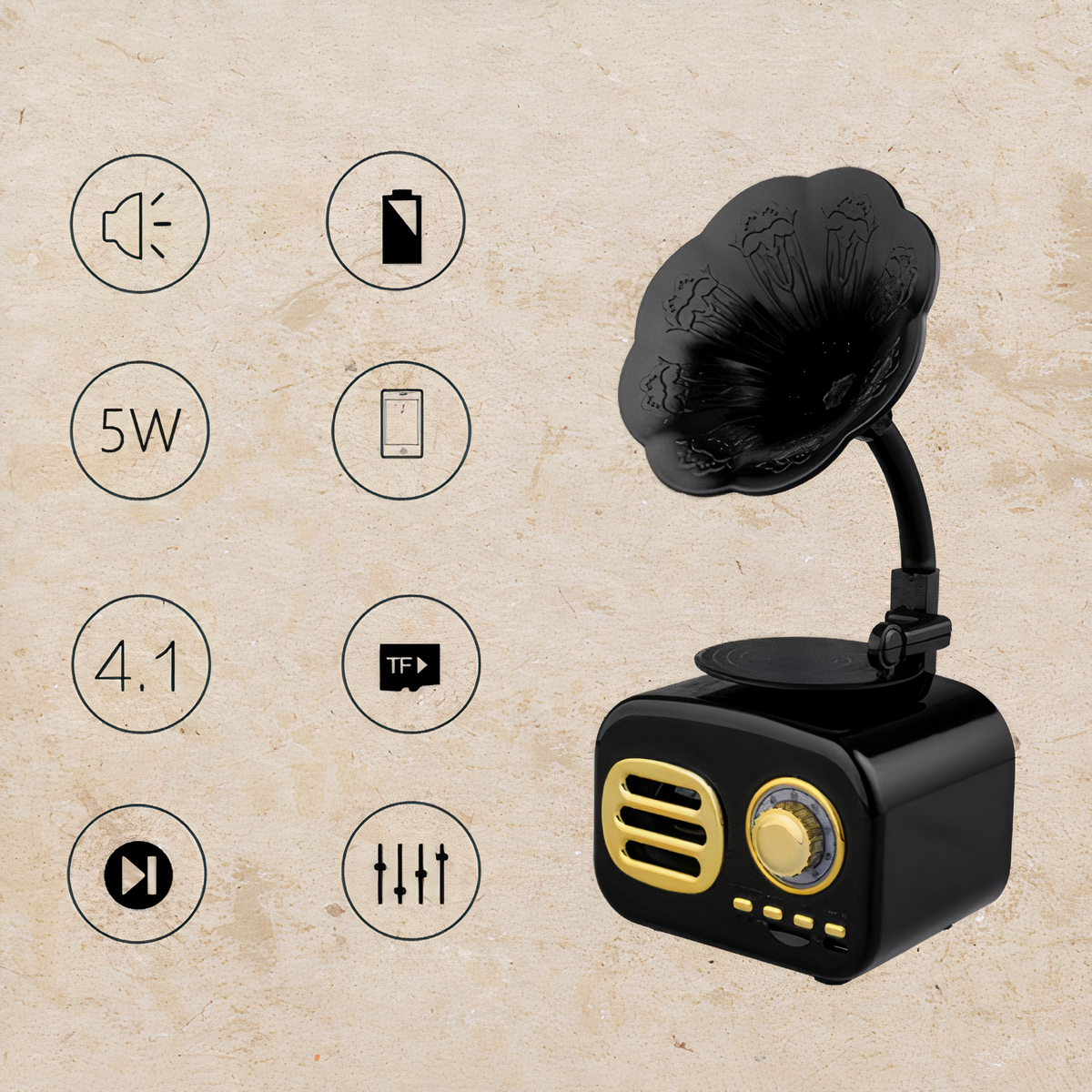 Découvrez notre enceinte bluetooth gramophone, elle est au style rétro et vintage. Cette enceinte elle est sans fil, portable et avec interface USB. Vous allez adorer avoir cette enceinte vintage comme décoration dans votre maison.