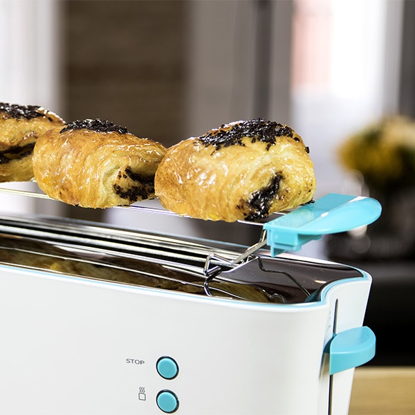 Notre grille-pain vintage dégustation classique, il a une seule fente, son utilisation est simplissime, aux formes arrondies et à la couleur blanche et bleu ciel. Il est pratique et élégant !