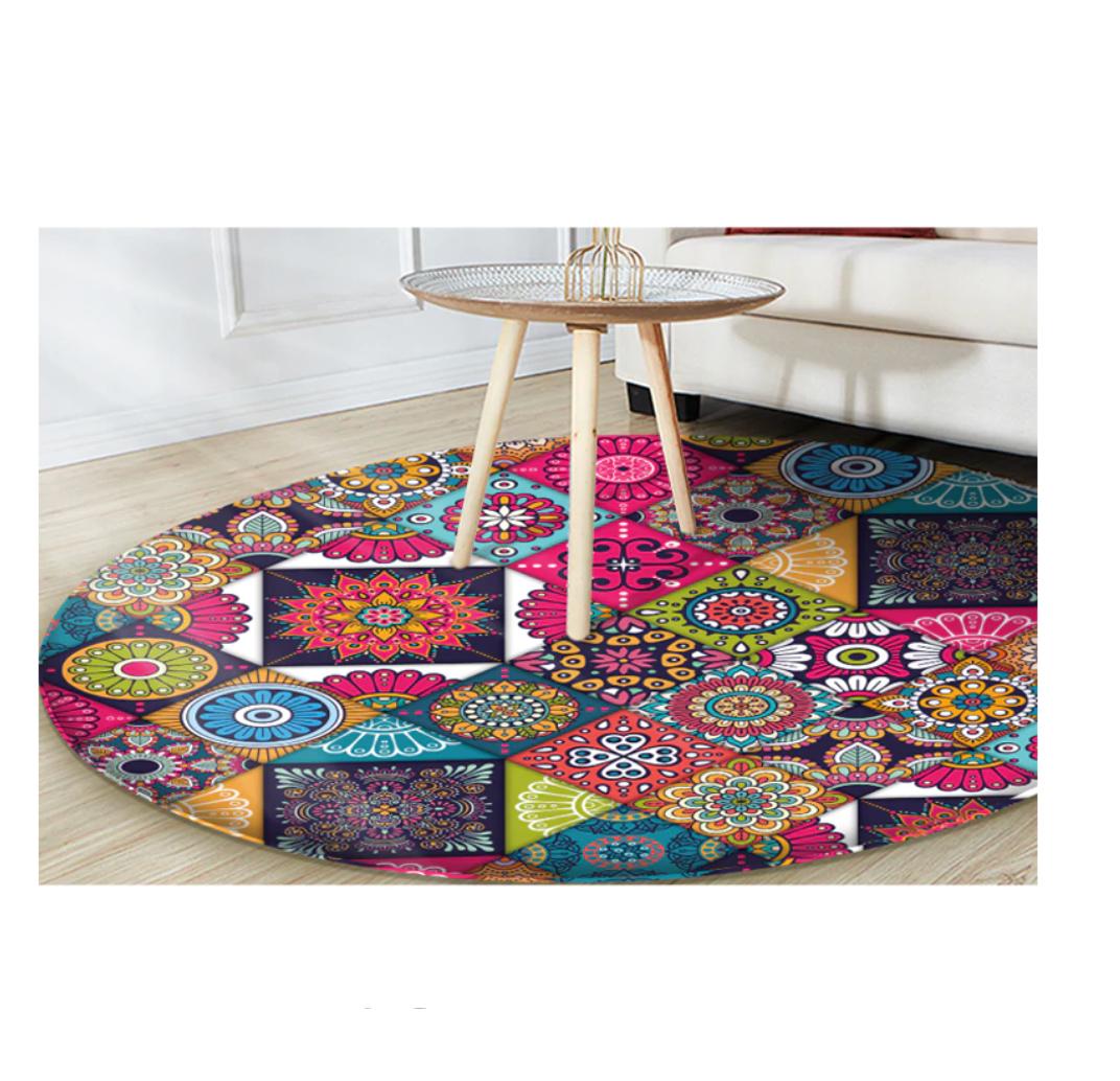 Ce sublime tapis de sol rond multicolore aux formes géométriques est un objet décoratif qui ne manquera pas d’animer votre intérieur. Un tapis style mandala de toutes les couleurs et les formes pour un style chaleureux, original et vintage. Regardez la vie de toutes les couleurs avec ce tapis qui vous ressemble.