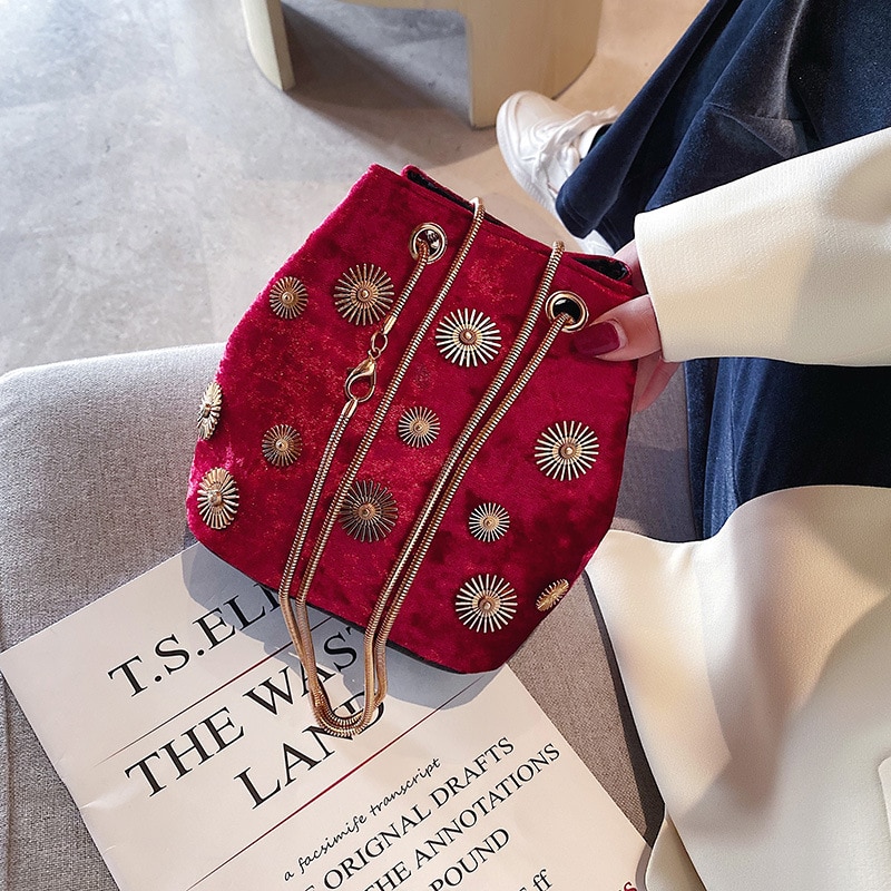 Optez pour ce sublime sac à main vintage en forme de sceau et en matière velours. Des motifs aux détails dorés avec en plus une chaîne dorée qui donne la touche bijou originale et vintage à votre look. Choisissez la couleur qui vous ressemble et adoptez ce sac ultra tendance et rétro.
