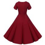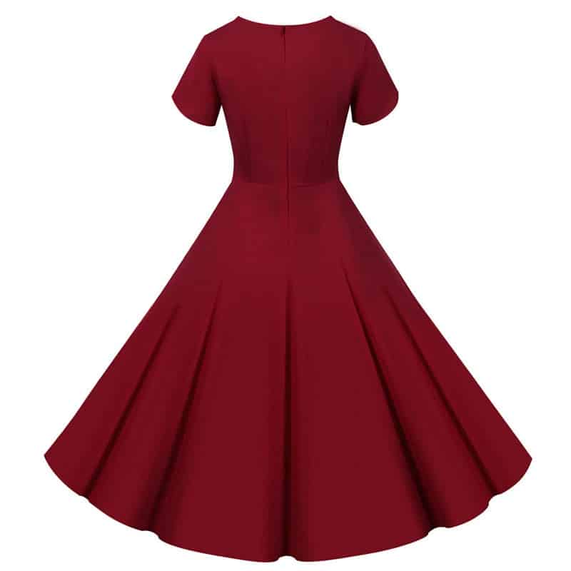 Cette robe année 50 bordeaux est un must-have pour votre garde-robe. Elle est conçue dans un tissu doux, qui est parfait pour les journées chaudes et les soirées élégantes. La coupe classique est complétée par des manches courtes et un col V, ainsi que par une taille haute qui souligne votre silhouette. Le bord inférieur est orné de dentelle fine qui donne à la robe une touche romantique et féminine. Les coutures sont soignées et délicates, ce qui en fait une pièce durable et élégante. Portez-la avec des escarpins pour un look intemporel ou avec des sandales pour un style plus décontracté. Vous serez certainement la reine de la soirée !