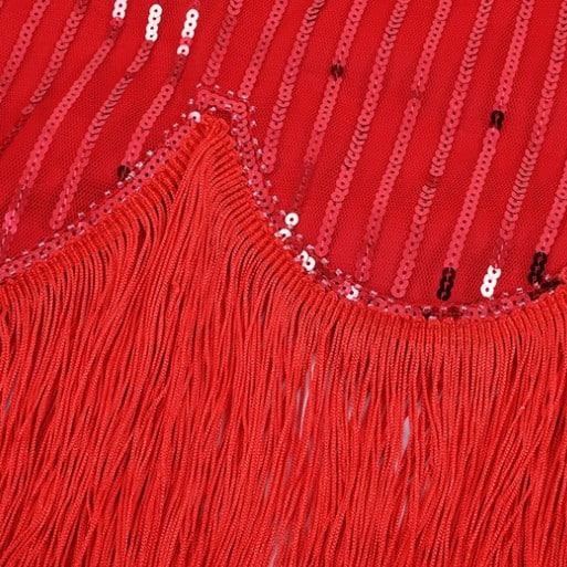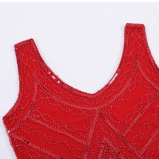 La robe Charleston rouge moulante à sequins est conçue pour épouser parfaitement les courbes du corps féminin, créant ainsi une silhouette flatteuse et sensuelle.